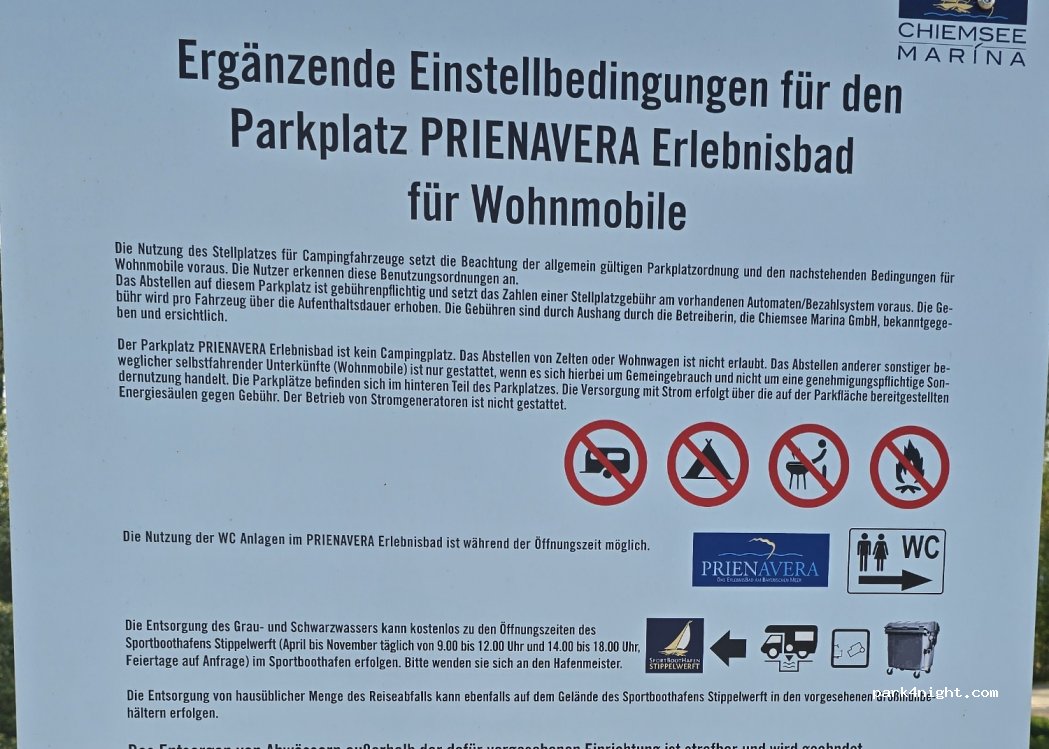 Toller Platz in direkter Nöhe zum See und zu den Ablegern der Chiemsee Schifffahrt Toilettennutzung in den Öffnungszeiten des Hallenbades möglich. Strom war bei unserem Besuch kostenlos.