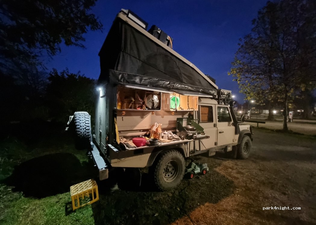 Gut ausgeleuchteter Platz. Im hinteren Bereich werden die Laternen in der Nacht abgeschalten. Die vorne an der Straße leuchten immer. Die Toilette ist im Schwimmbad und nur zu deren Öffnungszeiten erreichbar. Ansonsten weit und breit kein öffentliches WC in der Nacht offen. Am Stromkasten ist die eine oder andere Wattstunde vom Vorgänger verfügbar. Spitze.