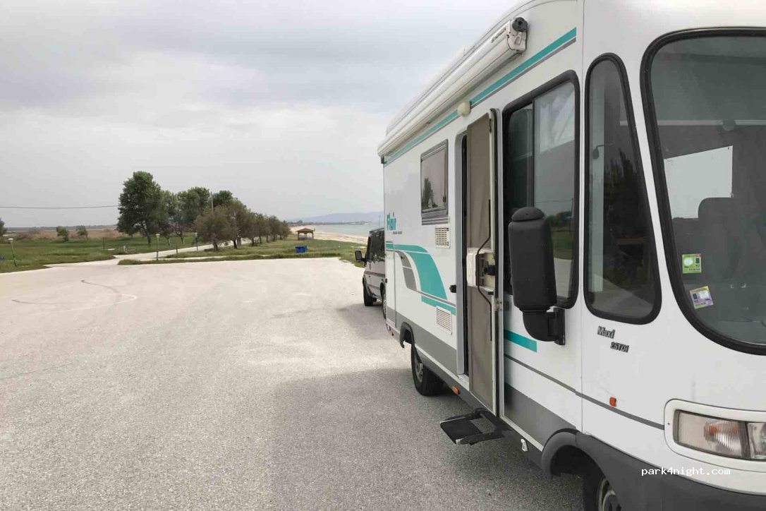 Страхотно място с широк плаж с душове и кофи за боклук. Страхотна гледка и плаж с пясък. Останахме две нощи. Има и заведения около паркинга.