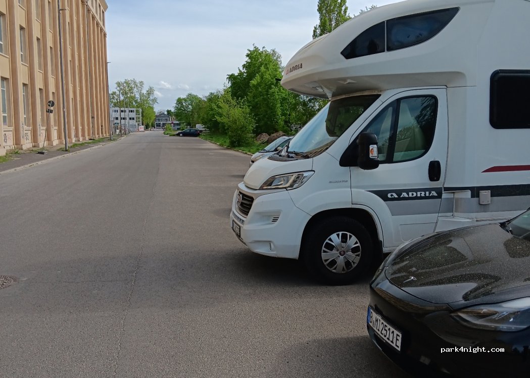 Sur le côté droit, la Wilhelminenhofstrasse est également adaptée aux nuitées de camping-cars longs jusqu'à environ 7,50 m (avec surplomb sur la pelouse). Nous y sommes restés deux jours et nuits sans aucun problème.