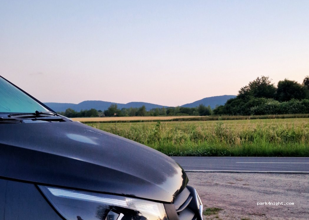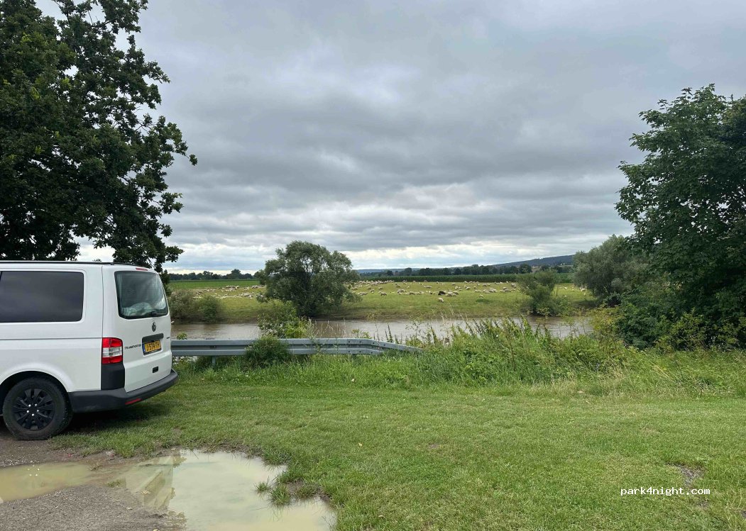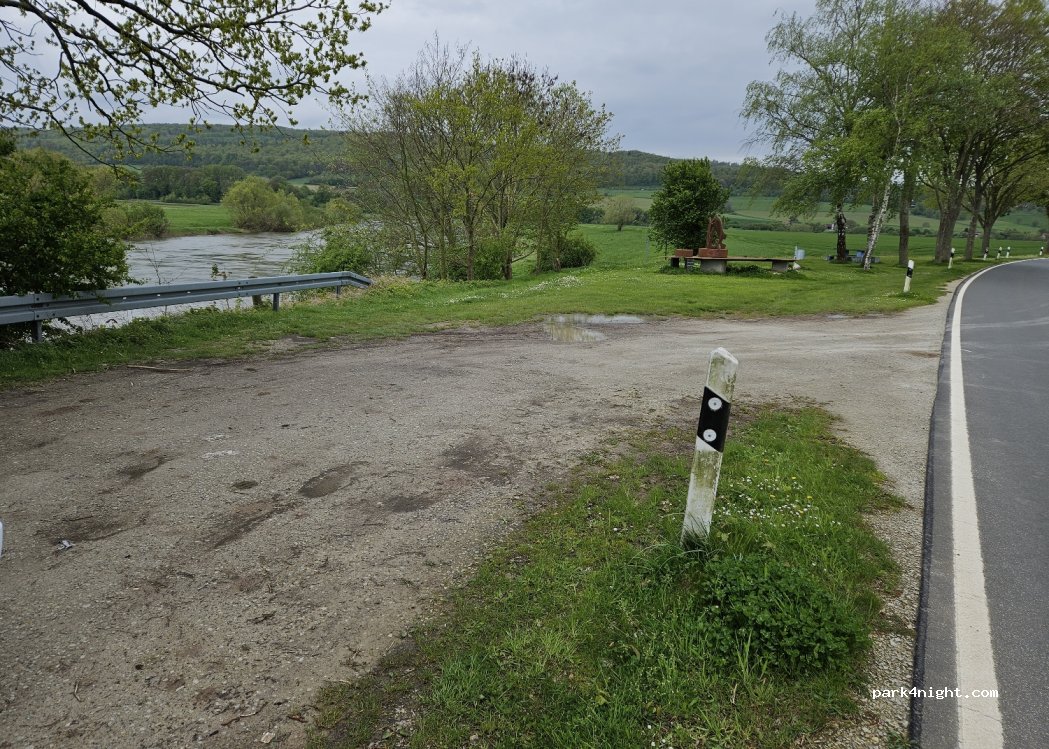 Schöne Aussicht auf die Weser und die Schaumburg. Direkt an der Weser, aber auch direkt an der Straße. 22 bis 6:30 Uhr kein, tagsüber wenig Verkehr. Der saust aber mit 100 km/h am WoMo vorbei. Kein offiziell beschilderter Parkplatz