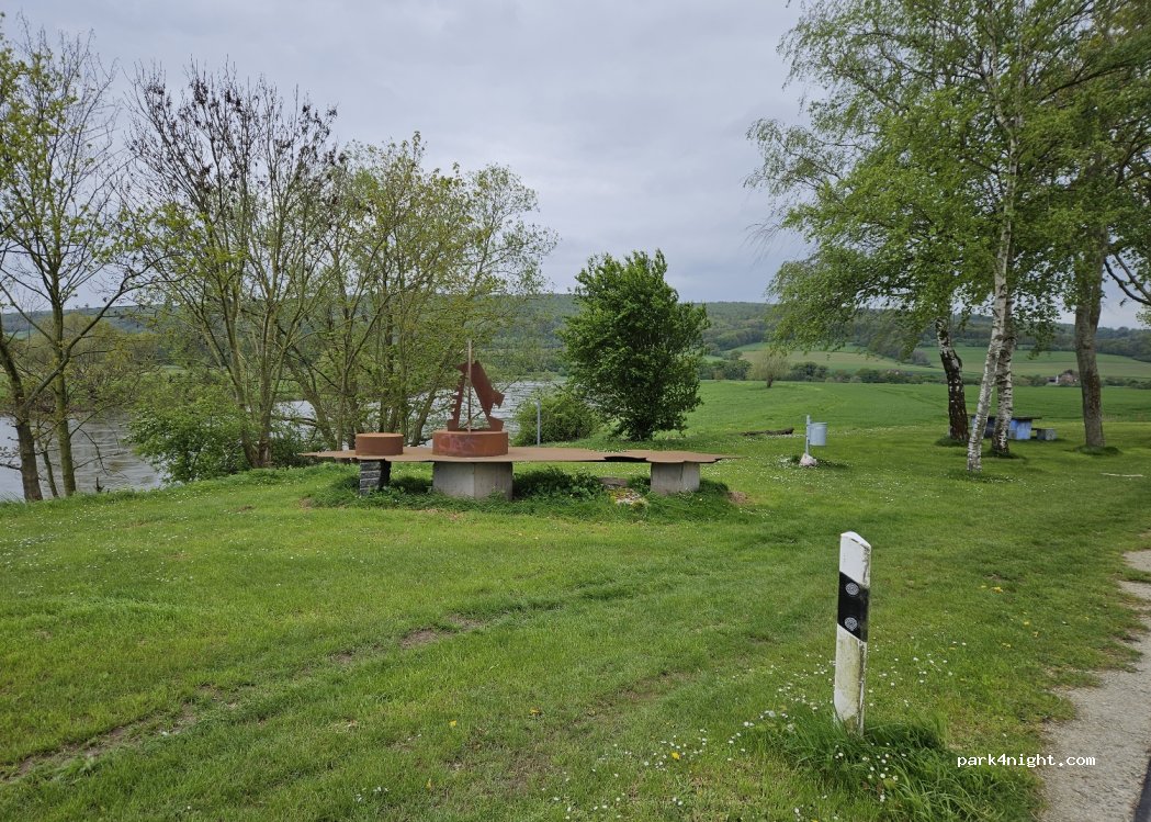 Sehr angenehmer Platz! Direkt an der Straße, aber fast kein Verkehr. Morgens hat man einen schönen Blick über die Weser und Möglichkeiten sich in die Sonne zu setzen. Es gibt auch ein Stahlkunstwerk zu bestaunen und einen Mülleimer.