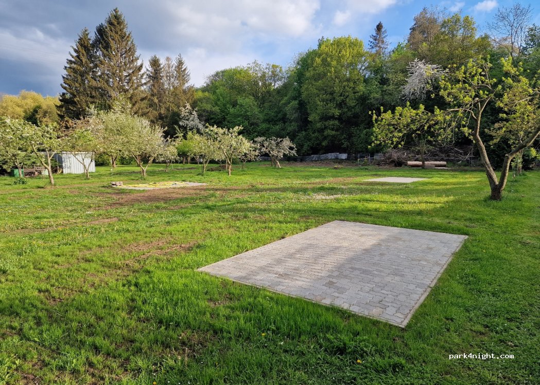 3 Stellplätze, teilweise Untergrund befestigt, in großem ebenen Obstgarten, romantisch gelegen. Möglichkeit für Lagerfeuer und Duschgelegenheit außen (aber nur lauwarm) vorhanden.