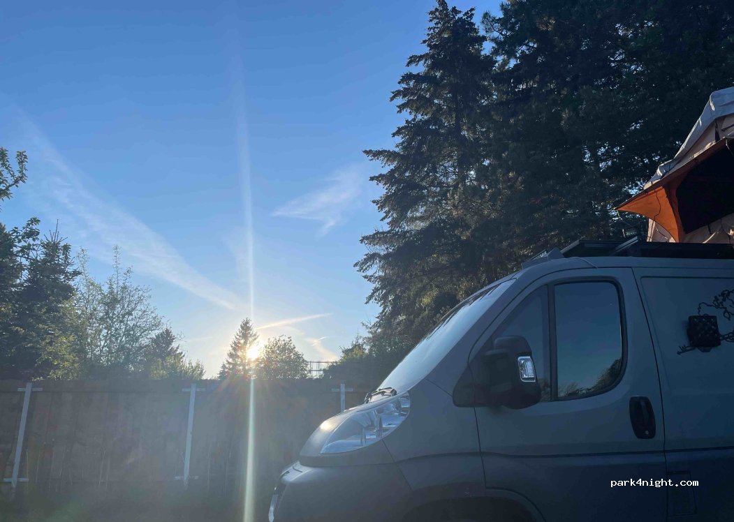200 m voorbij de tunnel gaat u linksaf de brug over en volgt u de borden Park4Night. Negeer het bord 2,3 ton tot u de ingang bereikt, geen probleem.