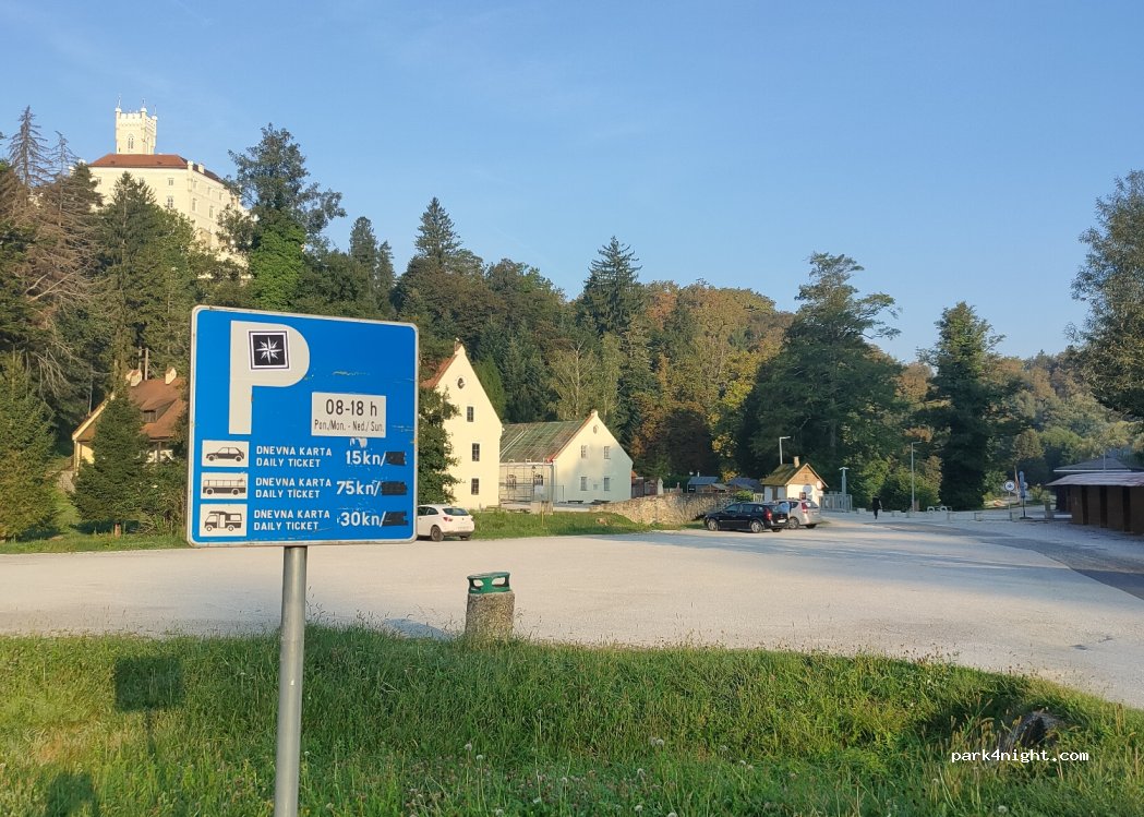 Dit is gewoon een parking voor het bezoek aan het kasteel van Trakoscan en het meer van Trakoscan. Volgens mij mag je hier eigenlijk niet overnachten, maar dat deden we toch. Geen problemen gehad. Het was een rustige nacht. Wij arriveerden hier op een zondag. Alles was gesloten. De meest nabije winkel is 20 km verder (Kaufland in Ivanec) dus zie dat je voorzien bent van water en eten.