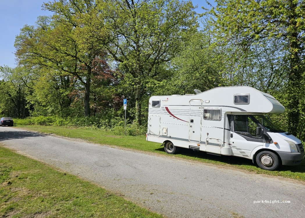 Trois places, panneau pour camping-cars. En bord de route sur herbe dans une impasse dans un quartier résidentiel. Absolument aucun comportement de camping n'est autorisé. Parking, randonnée, vélo, dormir.