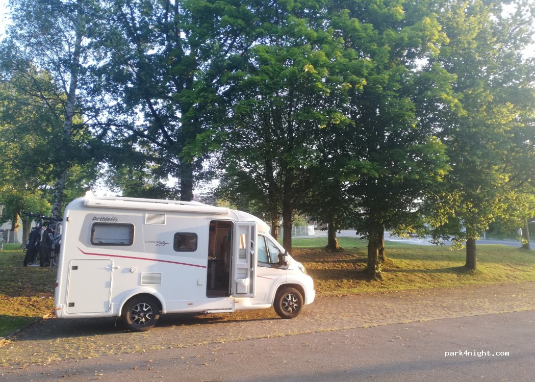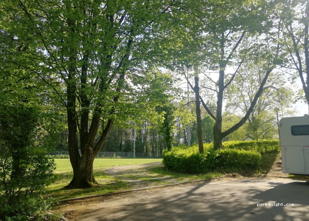 Parkeerplaats naast het voetbalveld en de Turn & Festhalle. Aan de rand enkele parkeerplaatsen waar je in de lengte kan staan. Tegenover grote Kinderopvang. Rustige omgeving.