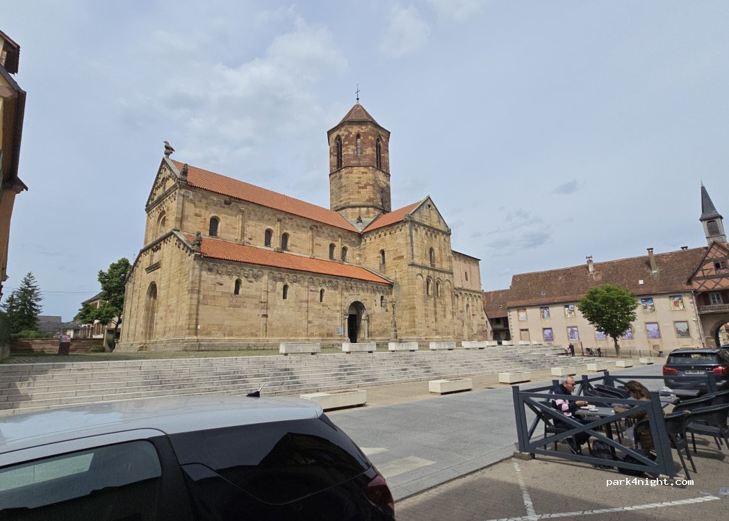 parking face aux écoles ,à côté de l air de jeux, beaucoup de arbres pas suffisamment haut pour stationner les c.car. mais le village est magnifique et très calme. un grand merci à la commune pour accueillir les c.car.
