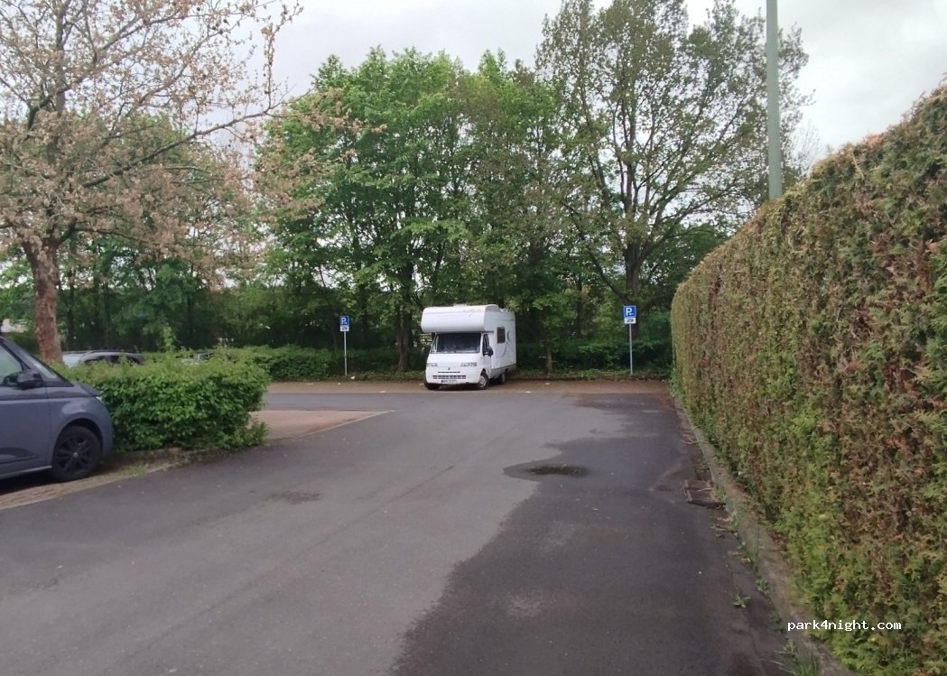 großer Parkplatz auf dem 3 Plätze in der Ecke durch Bäume beschattet, für Wohnmobile (bis 6,5m sonst guckt man vorne raus) sind. Keine Wohnmobil Services. Mülleimer gegenüber. Internet Telekom 5G. Einkaufsmöglichkeiten 2min fußläufig entfernt.