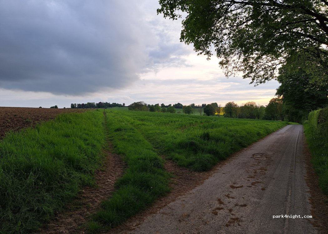 Place de parking à côté du terrain de football. Très calme lorsque nous y étions (du vendredi au samedi). Quelques villageois font leur ronde. Aucune commodité. Belle vue sur les champs.