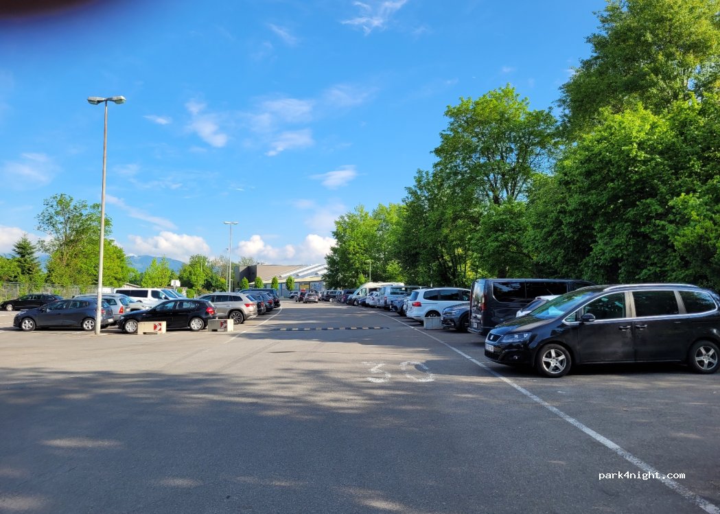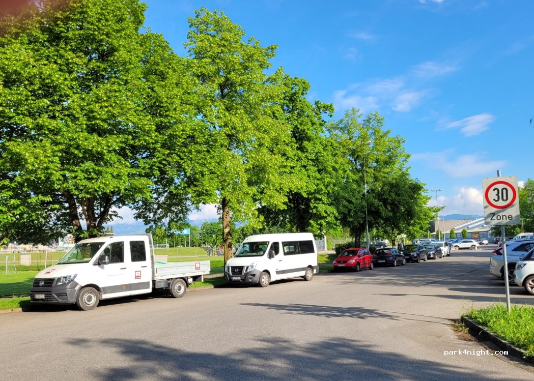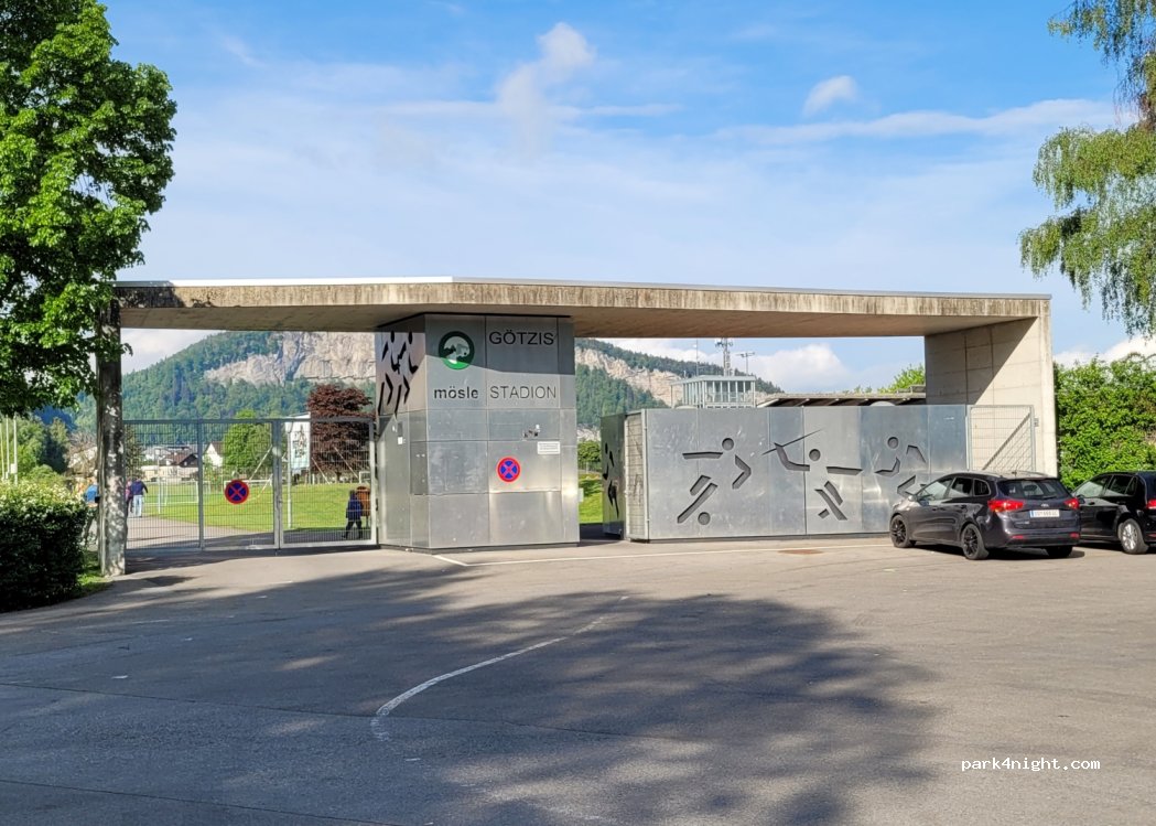 Großer Parkplatz am 'Götzis Mösle Sportstudion; am Ortsrand im Grünen, eben, asphaltiert;