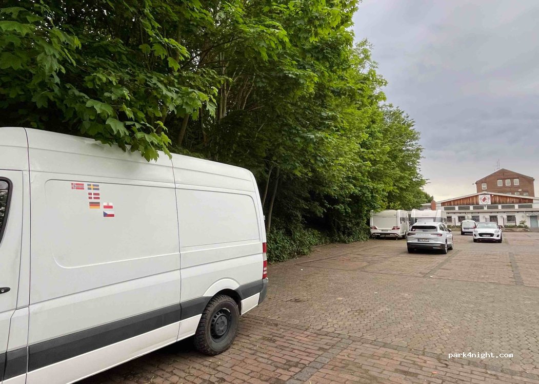 Parkplatz unter dem hohen Bahndamm zwischen den Bäumen. Park, See… Ebenes Gelände. Eine Nacht OK!