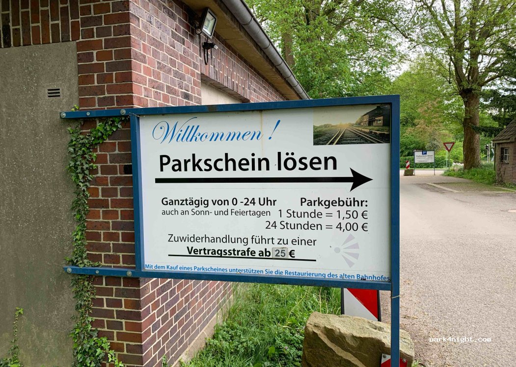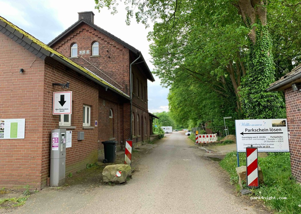 Schöne Lage direkt neben einer stillgelegten Bahnstrecke und Bahnhof. Direkter Zugang zu wunderschönen Ausflügen und Wanderungen. Der Parkplatz selbst ist zwar etwas rau, dafür aber ruhig. Kostenpflichtig, am Automaten oder über die EasyPark APP.