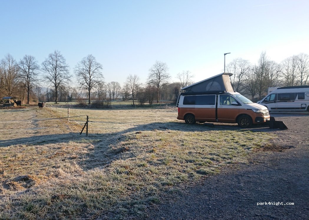 Schöner Stellplatz mit großenParzellen. Mit dem Heck zur Kuhweide gestanden, sehr idyllisch. Ordnungspolizei prüft die Parktickets schon ab 7 Uhr. gs