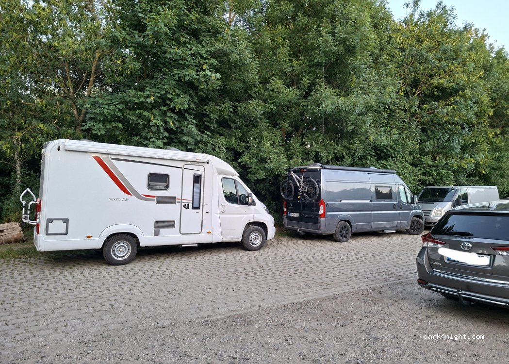 Parking lot on the edge of the Auensee recreation area. It is a large parking lot, but when there are a lot of visitors it gets crowded with campers, so I would say a maximum of 5 campers. You can hear the road a little during the day, but it is quiet at night.