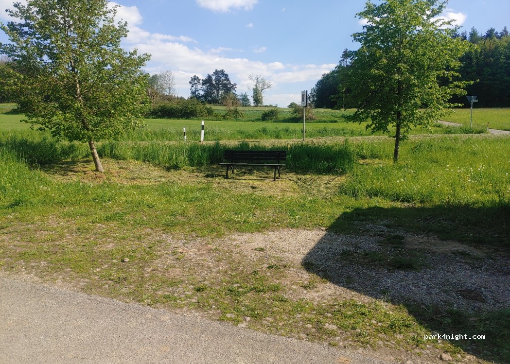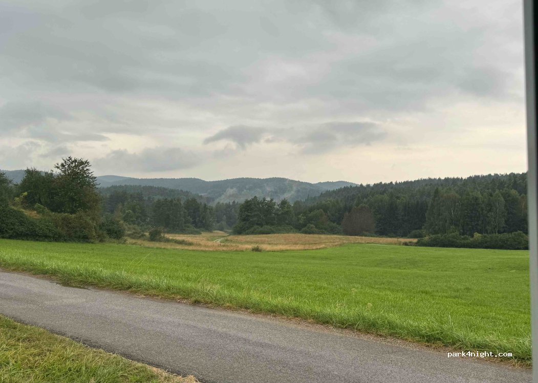 Place de parking sur une route de campagne peu fréquentée, calme la nuit. La banque est disponible, sinon pas de fournitures. La vue est magnifique, sur forêt et prairies.