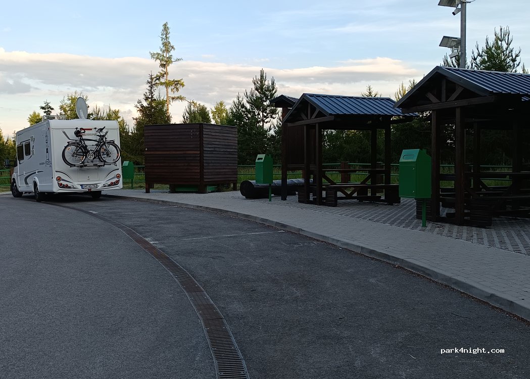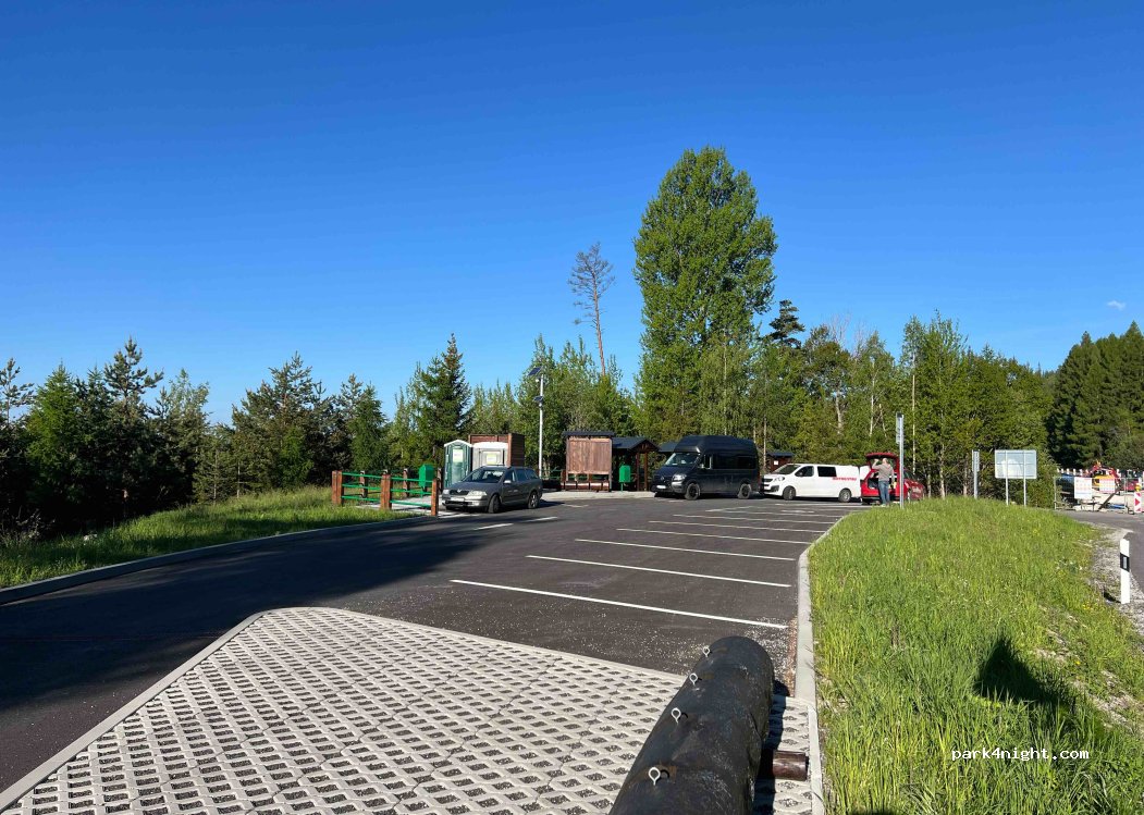 Zona de descanso recientemente reformada con plazas de aparcamiento gratuitas al margen de la carretera principal con dos aseos limpios (toi toi) y mesas de picnic. Algunas plazas de aparcamiento también son adecuadas para autocaravanas grandes. Aunque está justo al lado de la carretera principal, por la noche hay muy poco tráfico. El puente cercano está actualmente en renovación, por lo que se espera ruido de los trabajadores durante el día. Cámaras vigilan la zona. Excelente señal móvil/Internet LTE. Río cercano con hermosas vistas de las montañas Tatra.