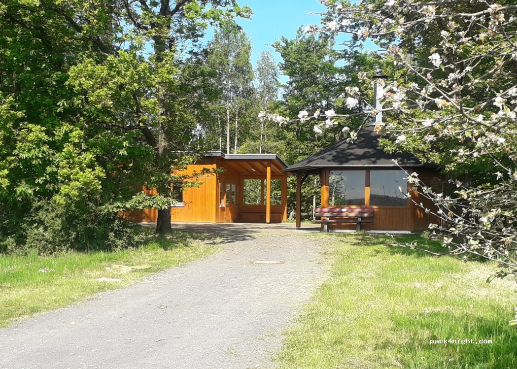 En el campo de deportes Morshausen Beulich, siga siempre por Römerstrasse hasta el campo de deportes y las indicaciones hacia Ruhewald. Choza con parrilla, estacionamiento y solo una vista verde sin casas.