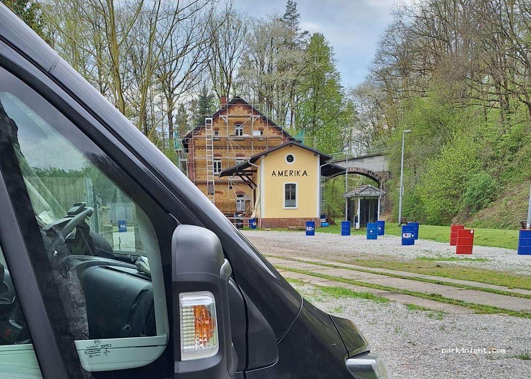 Ehemaliger historischer Bahnhof von Amerika in Sachsen (bei Penig, Chemnitz). Stellplätze auf riesigen Gelände, umgeben von viel Natur: Wald, Felder, Fluss mit Wehr und Brücke.