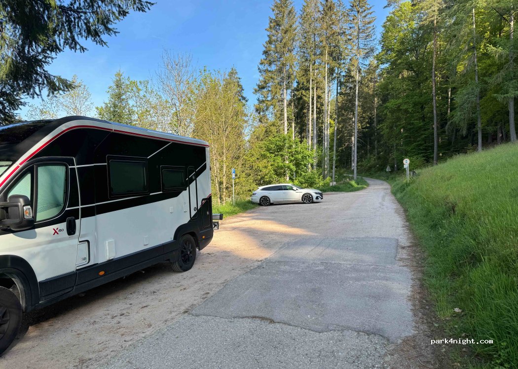 Stayed for one night. Had dinner outside on a bench. Several people pass by, seemed like they didn’t mind. Good data reception. Close to the forest. Virtually no road noise. Room for maybe 3 vans. Had this place to myself. Ground is not level though. Nice quiet night.