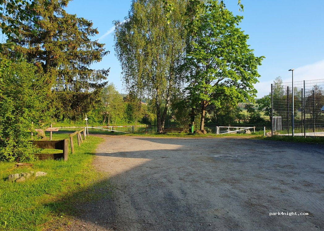 Kostenloser P der Gemeinde für 2 Wohnmobile am Freibad/Eishalle/Tennisplatz. Daneben ein kleiner See mit Spazierwegen. Nachts sehr ruhig, tagsüber wenige Spaziergänger.