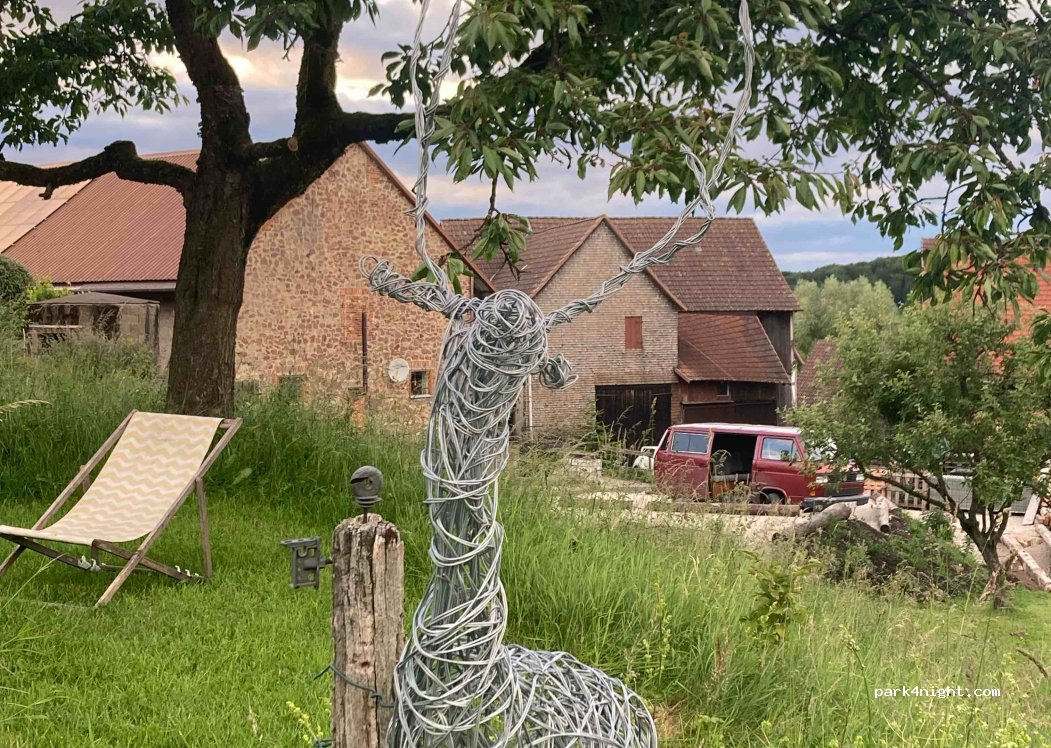 LE LIEU : Nous proposons 3 places de parking dans la commune de Rückersfeld, une ville de 30 habitants, dans l'arrière-pays du nord de la Hesse. Entouré d'une nature calme et avec vue sur la campagne. Les visites peuvent être commencées d'ici à vélo ou à pied, nous serons heureux de vous fournir des informations à ce sujet. Vous êtes également les bienvenus dans notre usine de tapis, nous serions heureux de vous donner un aperçu de notre métier.