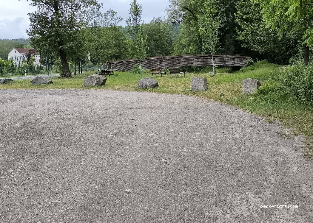 C'est un endroit tranquille en gravier à côté de la route, en face d'un terrain de football. Un petit ruisseau coule ici, il y a des bancs et une poubelle. Vous pouvez y faire une pause ou passer une nuit sans être dérangé.