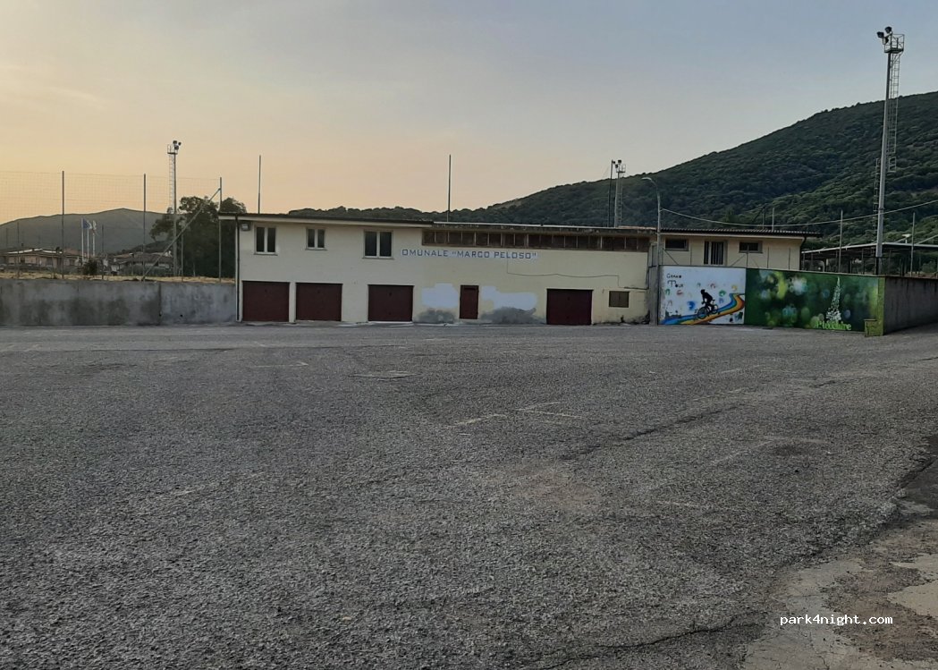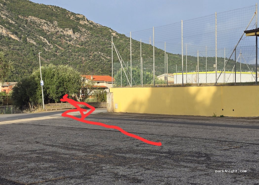 Buen sitio para dormir, excepto los miércoles por mercado. Tienes agua para repostar. Justo antes de la puerta de cementerio hay unos lavabos, diferenciados, con jabón, agua, papel, etc. y muy limpios. Paseamos por la calle comercial y consumimos unos campari sprirz baratos. Spar a la entrada del pueblo si vienes de Iglesias. Hacia Arbus mejor sal por la flecha roja de la foto, llegas a la SS126