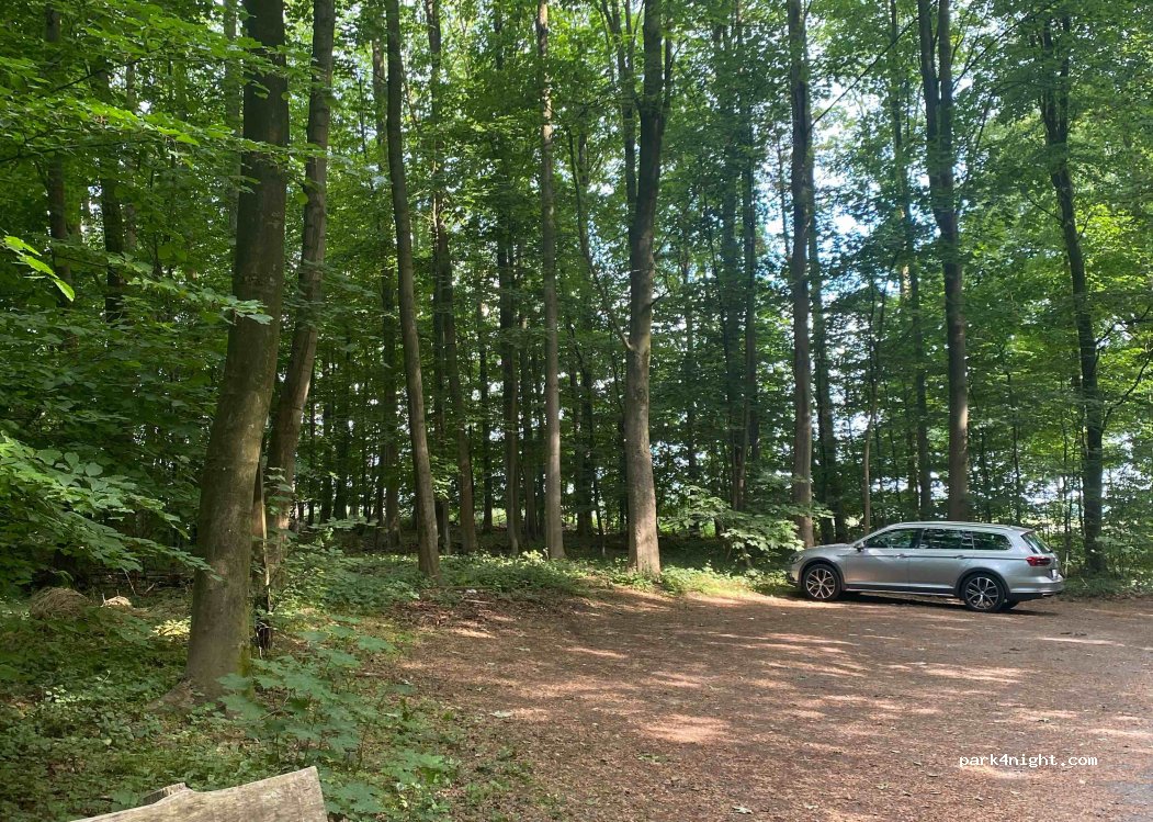 Schattiger Stellplatz an Trimm Dich Pfad. Morgens werden auf dem Zufahrtsweg Kinder zum Waldkkndergarten gebracht. Eine Holzbank ist direkt am Parkplatz und unzählige weitere im angrenzenden Waldstück. Kein Mülleimer vorhanden.