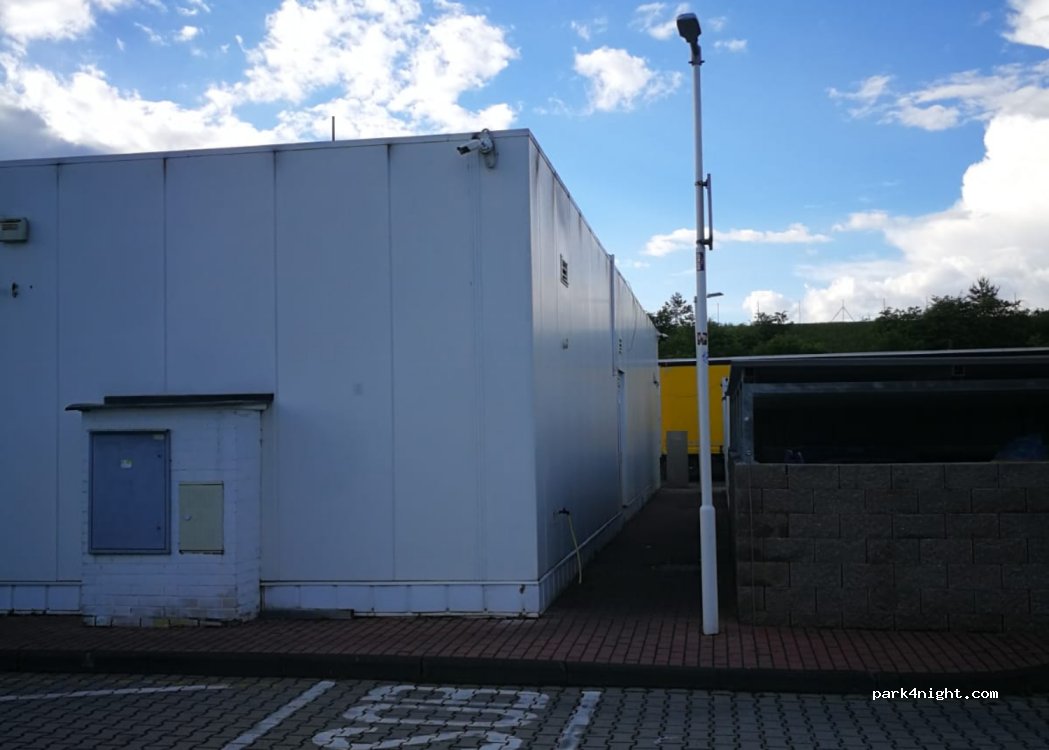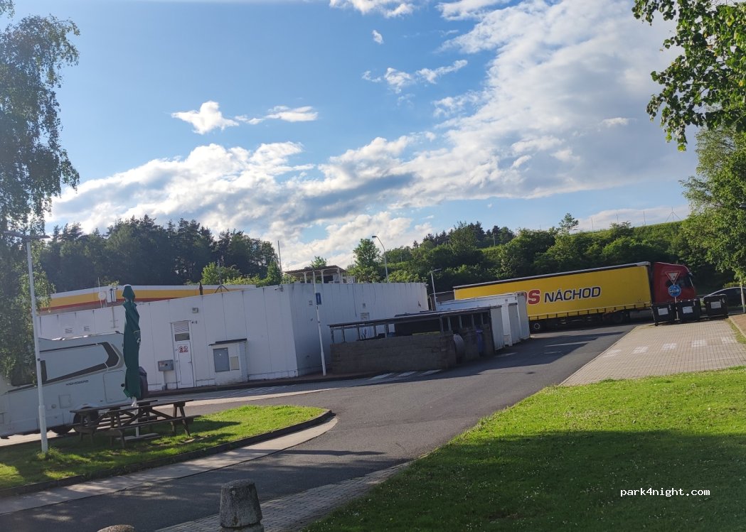 Derrière la station Shell se trouvent des places de parking avec des tables. Je pense qu'il pourrait également être utilisé pour des nuitées. (vous passez la gare par la gauche, puis après la gare vous tournez à droite). La première ligne est écrite comme "pour les clients uniquement et 2 heures maximum", mais les autres semblent convenir.