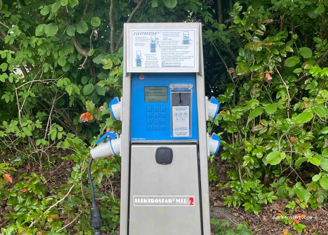 Platz ohne V/E aber mit Stromsäulen zum Zahlen. Ruhig auf Rasen, könnte bei starkem Regen schwierig werden. Kostenfrei, Bäckerei 5 Minuten zu Fuß.