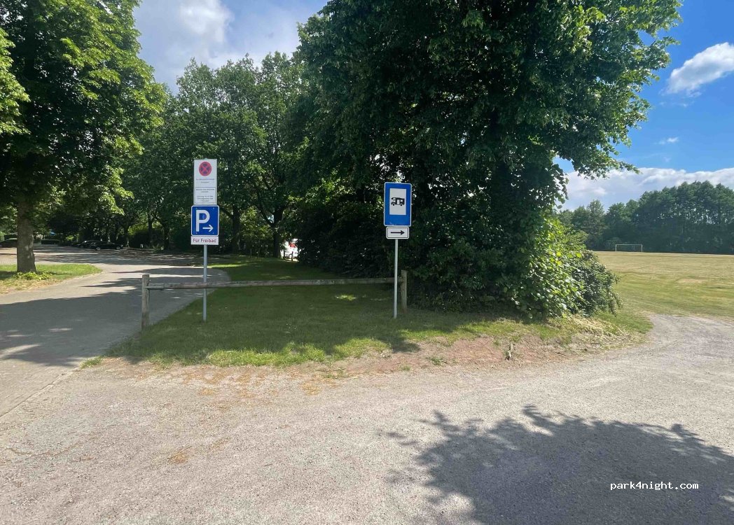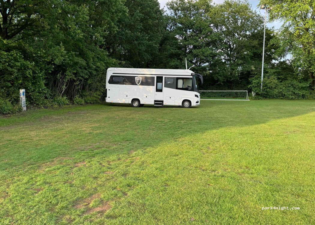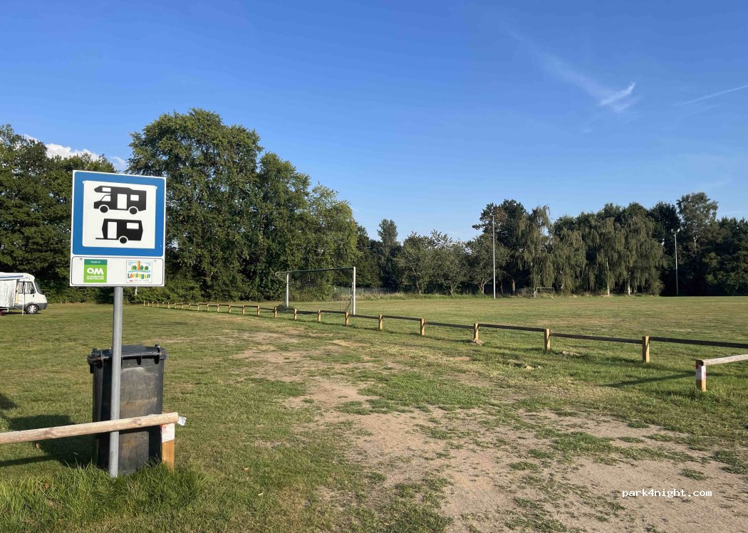 Der Stellplatz befindet sich auf einem Ausweichparkplatz für das Freibad. Am Rand von einem Fußballfeld. Stellplätze sind auf Rasen.