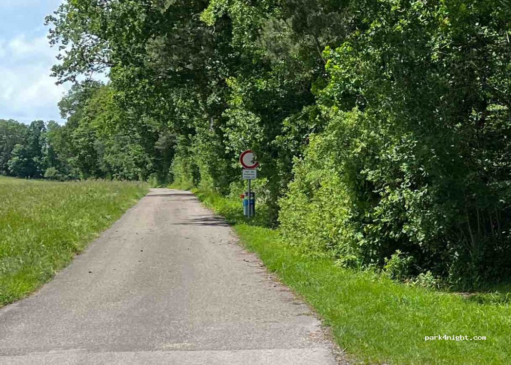 Parkplatz im Wald nahe der Landstraße. Mülleimer an der Kreuzung vorhanden. Morgendliche Spaziergänger hauptsächlich am Wochenende.