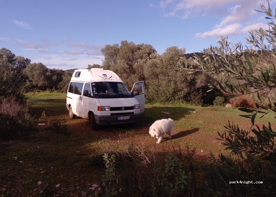 Just at the side of a dirt road, a nice place to park/camp. 2 spots (max. 3). Rural and secluded. Some olive trees (don’t provide real shade though). Little background sounds from the A22 highway, but during the night definitively quiet enough.