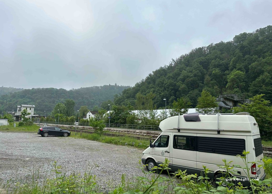 Gravel parking lot by the railway, only one train came during the night. Passenger traffic began around 8 a.m. Otherwise the place is very quiet. Access via a gravel road. Signposted as a parking lot. Relatively flat.
