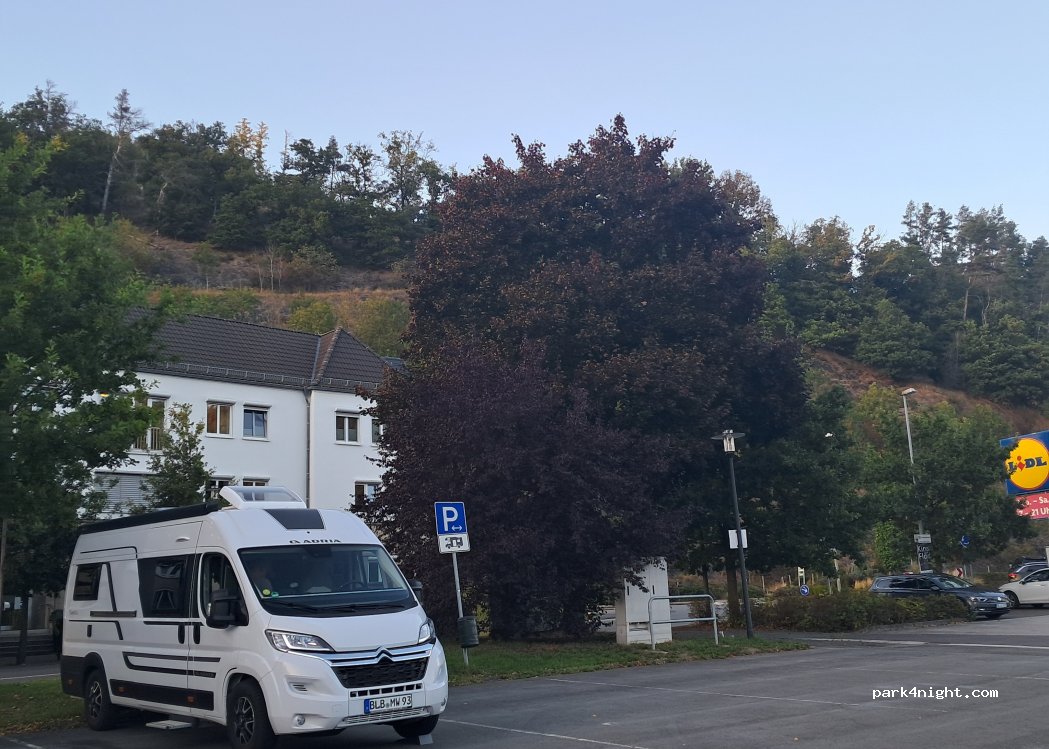Plaats voor 4 campers op groot parkeer terrein waar ook de Lidl zit (Lidl zit in een hoek).Geen voorzieningen. Je loopt zo het centrum in. Drukke weg, in de nacht rustig.