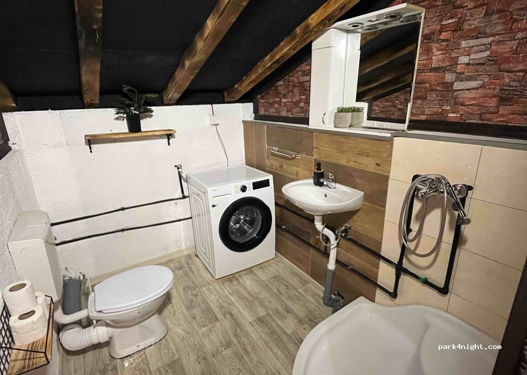 We have two bathrooms, a washing machine, a kitchen, an electric barbecue, and a wood-fired barbecue.