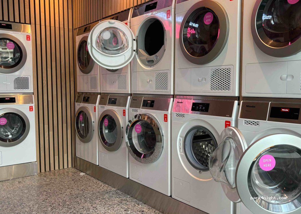 "Clean Kokos" laundromat is clean and simple to use. Can park outside for one hour.