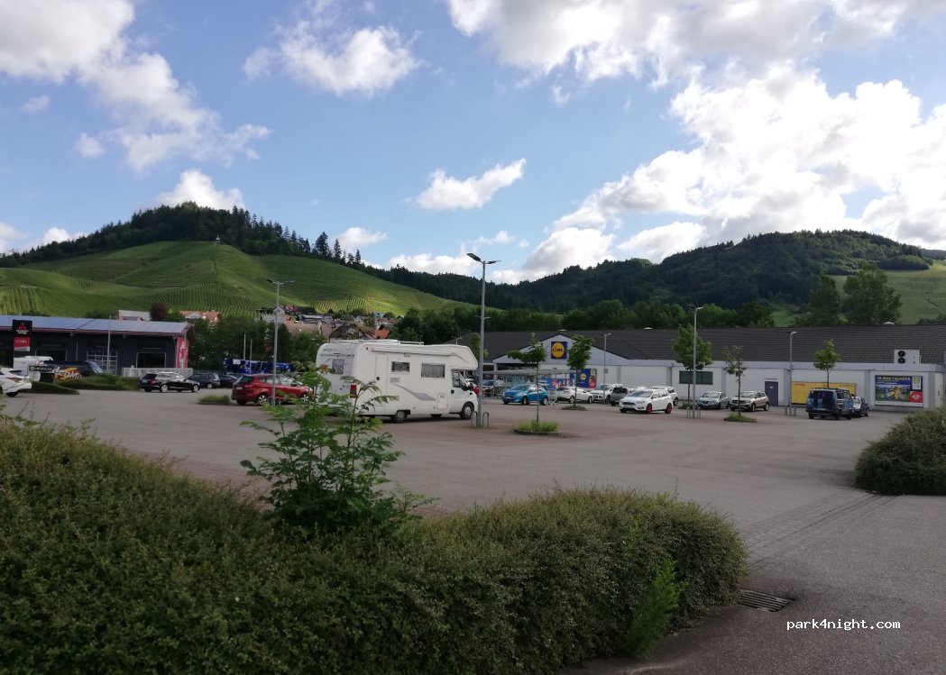 Parkplatz des Lidl-Supermarkts. Flach und geräumig, auch für große Wohnmobile.