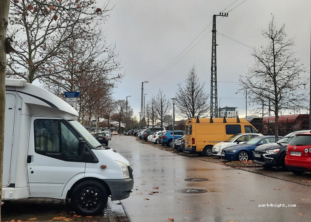Great option to visit Rosenheim. €1 for 24 hours. Payment via parkster app. We spent a quiet night. As a 6.2m van we just fitted using grass verge for overhang. Full when arrived but we waited for around 20 minutes for next train from Munich and space became available.