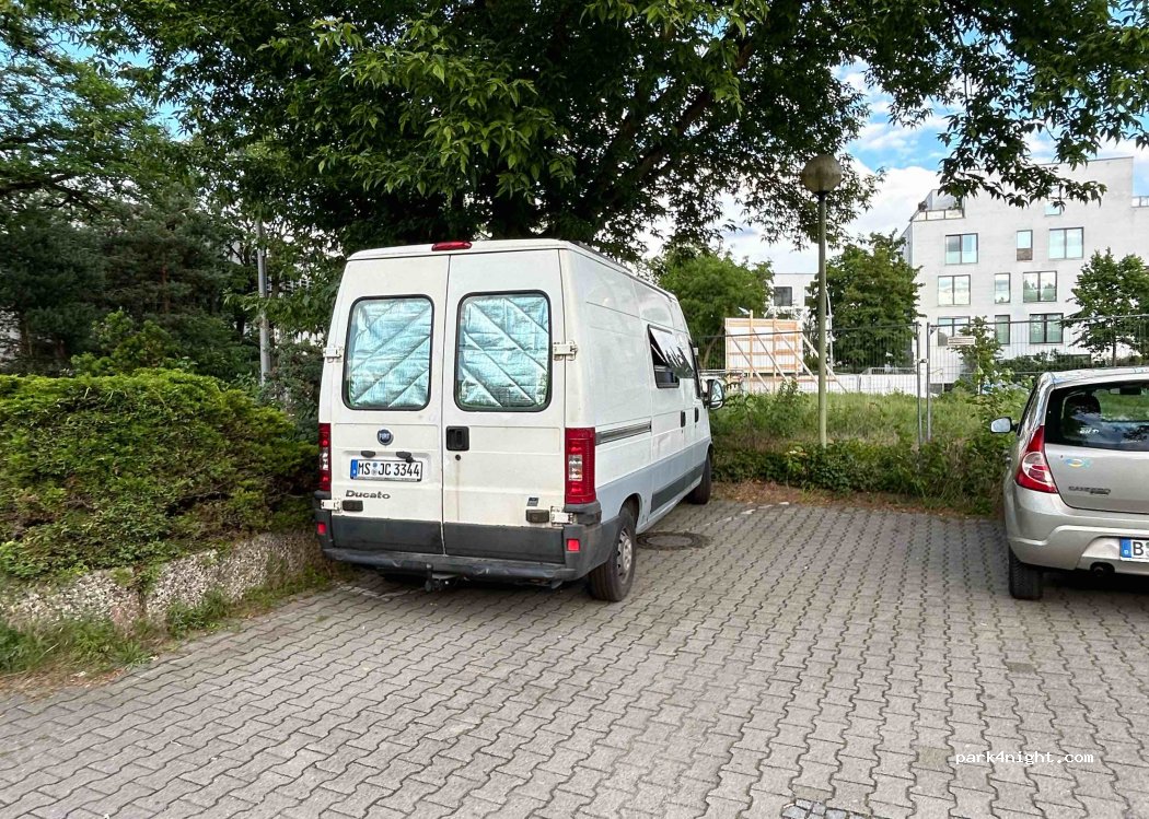 Un parking devant une salle de sport et une piscine couverte. Le parking est divisé en 2 parties, la partie devant la salle de sport est gratuite, la partie côté piscine est payante. Pas complètement calme car il y a beaucoup d'activité dans la salle de sport et la piscine couverte pendant la journée, mais quand même assez détendu pour Berlin. Aucun panneau interdisant le camping. Je me sentais en sécurité.