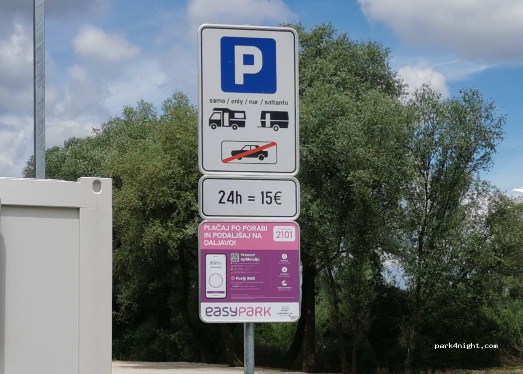 Grand parking à plat, beaucoup de places. Aucun service. Nous avons payé avec l’application EasyPark 17,25€ les 24h. Très bruyant la nuit car au bord de l’autoroute. Nous avons rejoint facilement le centre de Ljubljana en 20 minutes à vélo. Très belle ville.