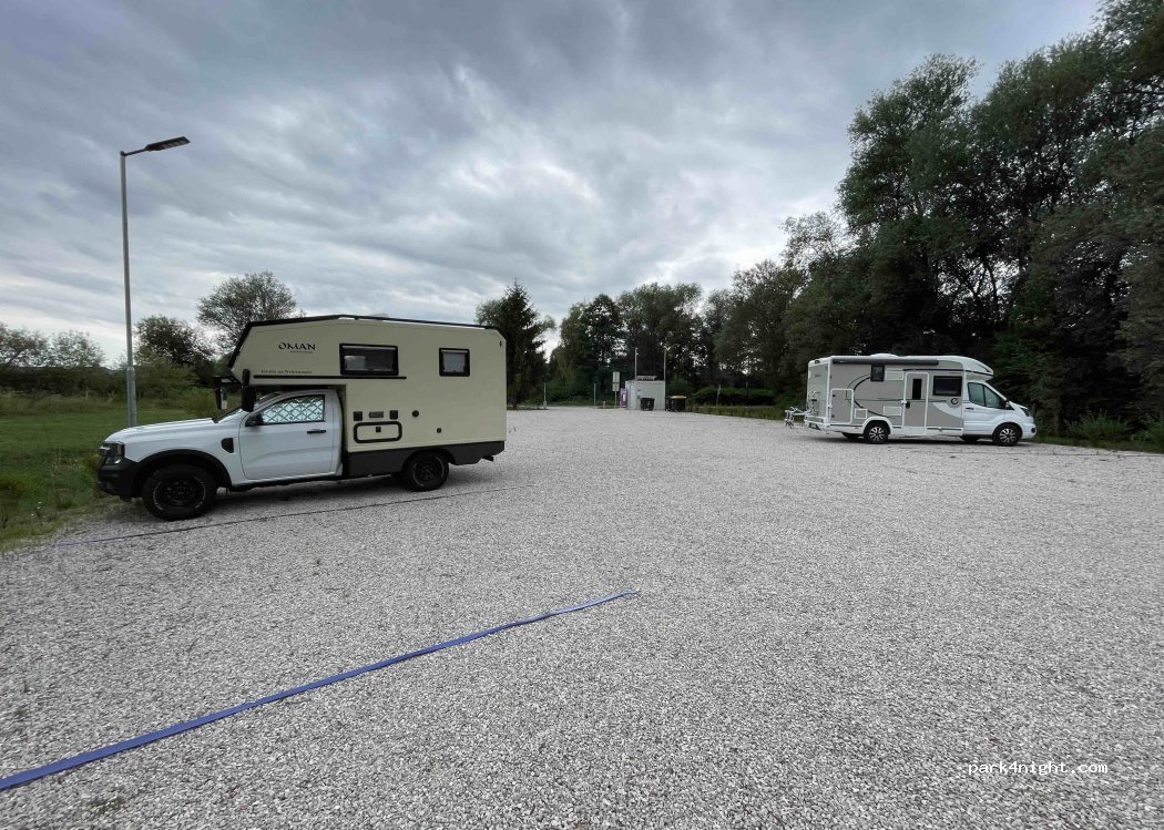 Idéalement placé pour visiter Ljubljana si on a des vélos (10 minutes en vélo). Aucun service et poubelles qui débordent quand on y était. En partie ombragé. Autoroute en bruit de fond mais le bruit étant régulier cela ne nous a pas dérangé pour la nuit, même avec les lanterneaux ouverts. Il faut compter 17€ et non 15€ car 2€ supplémentaires de frais app