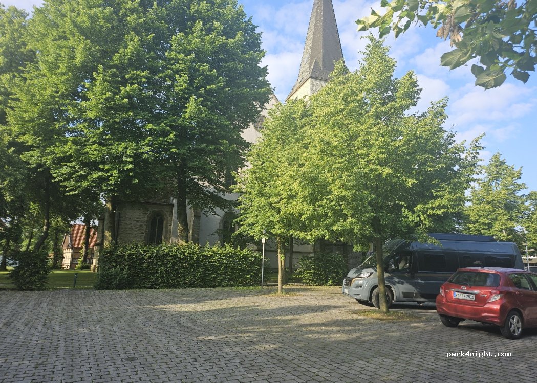 Ein ruhiger, von Bäumen gesäumter Platz neben der Kirche in einer sehr angenehmen und einladenden Stadt