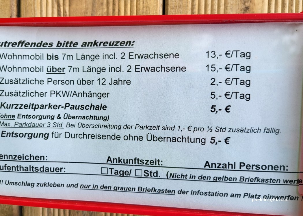 Ein wunderbarer kleiner, ruhiger und geräumiger Stellplatz, ähnelt eher einem Campingplatz ohne Sanis. Preise für 24 Stunden (von 12 bis 12 Uhr): bis 7 m 13 €, ab 7 m 15 €, 3 Großplätze +5 €. Wer ohne Anmeldung einen Platz belegt, sollte - wenn keiner vor Ort ist - sofort die ausgehängte Handynummer anrufen, damit der Platz im Buchungssystem nicht als frei erscheint. Wir kommen gern wieder!
