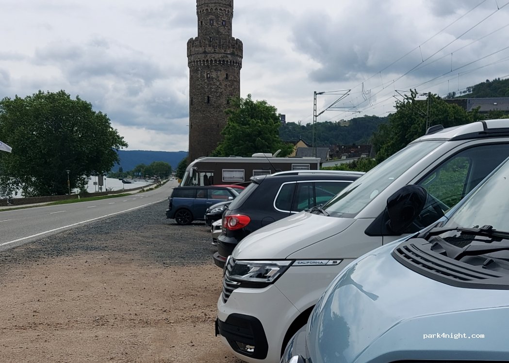 Sosta mista con auto, davanti al fiume Reno,molto rumorosa passano treni ogni 10/15 minuti anche durante la notte. Costo 8€/24 ore da pagare con moneta al parchimetro oltre la strada, tariffa Wohnmobil.