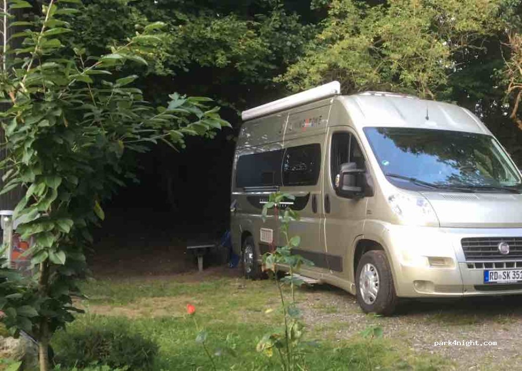 Emplacement standard pour camping-cars ou petites caravanes, dans un cadre verdoyant avec pelouse et jardin. Table et chaises sont à disposition. Convient partiellement à un grand camping-car intégré.