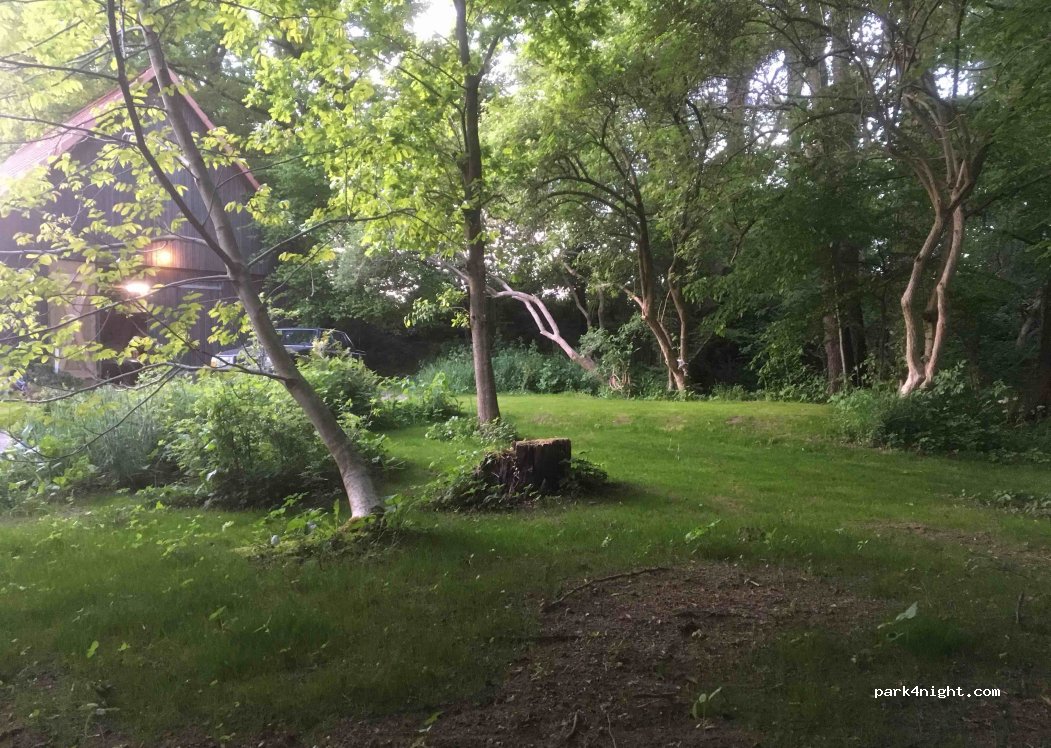 Ein normaler Stellplatz für Wohnmobile oder kleine Wohnwagen im Grünen mit Rasenfläche und Garten. Tisch und Stühle vorhanden. Für ein großes vollintegriertes Wohnmobil nur bedingt geeignet.