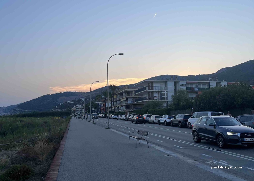 Aparcamiento en la zona blanca en primera línea de mar, cerca de la playa. Al final hay amplias plazas de aparcamiento que no dan a la carretera.