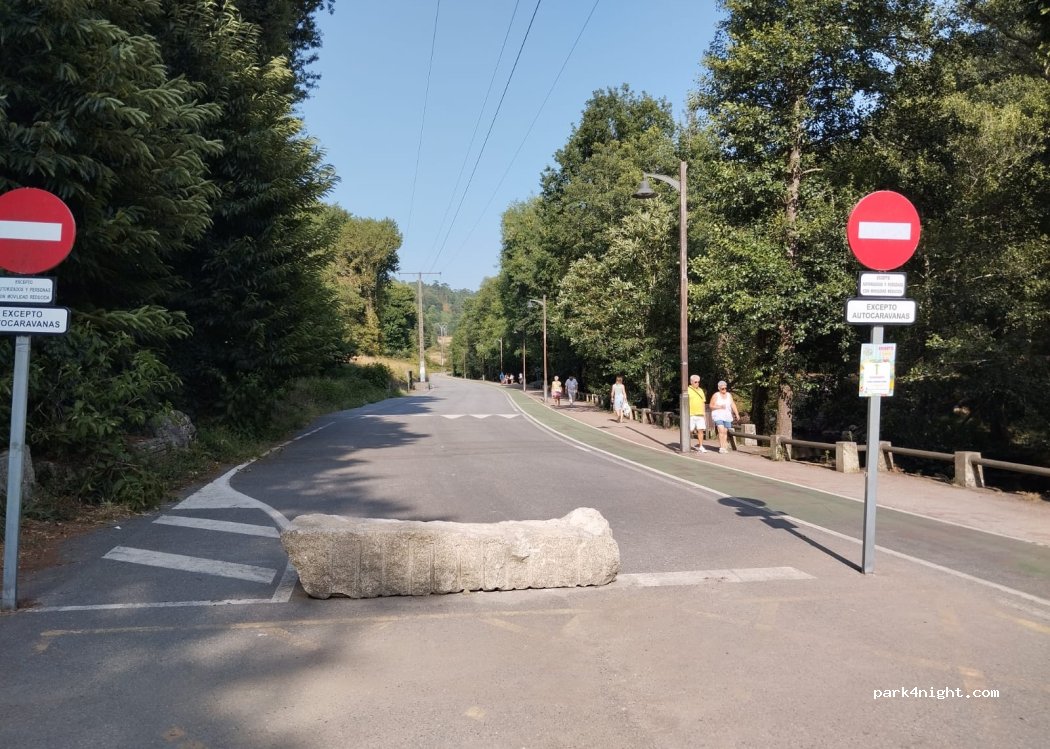 Acceso cerrado con un bloque de granito. Toda la señalización sigue en su lugar indicando a ese sitio como parking de caravanas, pero es imposible acceder.